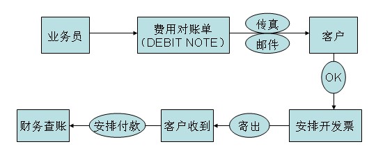 2、在与客人对单同时,打DEBIT NOTE(帐单)传给客人,要列明所有产生的费用、汇率,根据客户情况打上公司帐号或私人帐号,收款银行资料只能提供一个给客人,传真后电话确认客人是否收到,并请客人确认费用,不需要客人签名回传,但付款底单一定要提供。如果客户要求开发票,将《开发票申请单》传给客户填写后传给我司财务,并将发票寄出,操作跟进全部发票开出、寄出及签收状况。